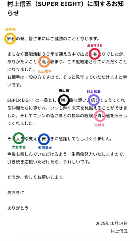 @miogto07村上信五さんの結婚発表リリース メンバー名前入ってるよね? 粋な計らい😆 錦秋の候⇒【錦】戸亮 山あり谷あり⇒渋【谷】すばる 丸く収まり⇒【丸】山隆平 横に寄り添い⇒【横】山裕 信じて支えてくれる⇒村上【信】五 貴い道を⇒内 博【貴】 大きな支え⇒【大】倉忠義 安らぎに感謝⇒【安】田章大 pic.x.com/bYKkfhoft0